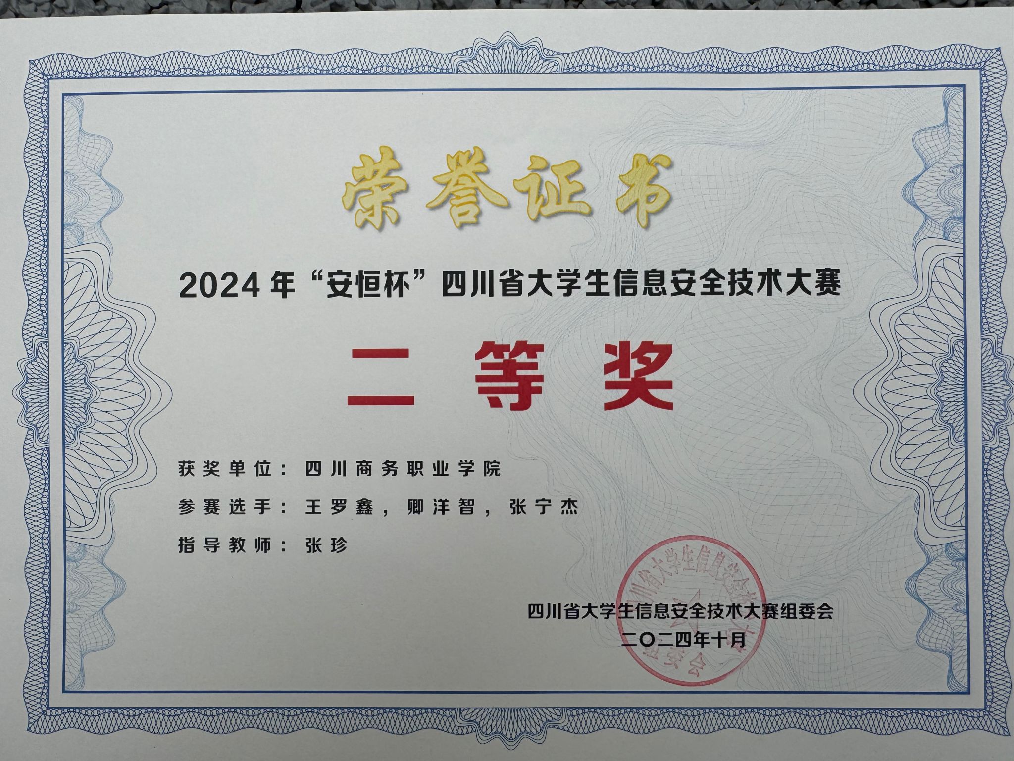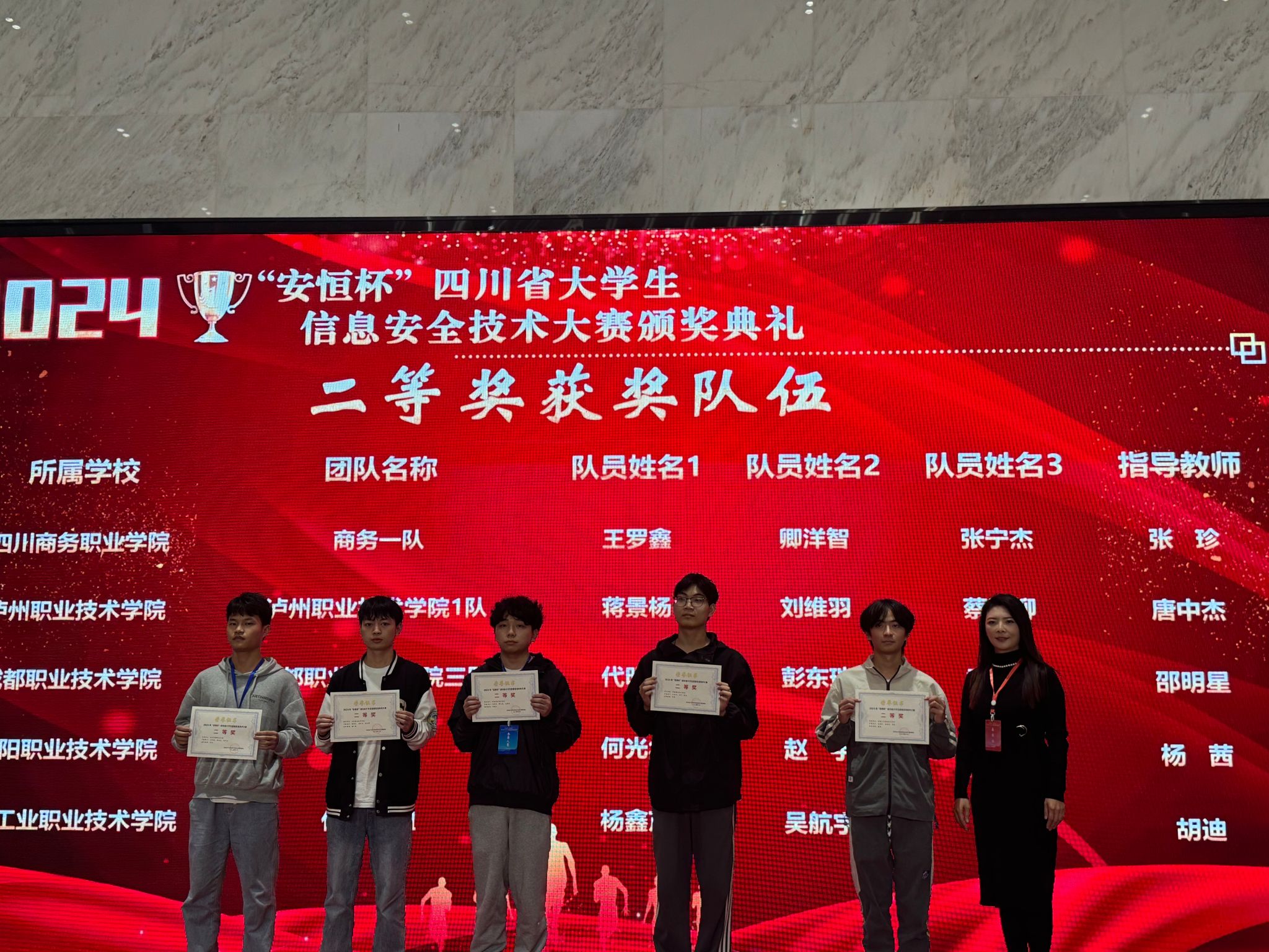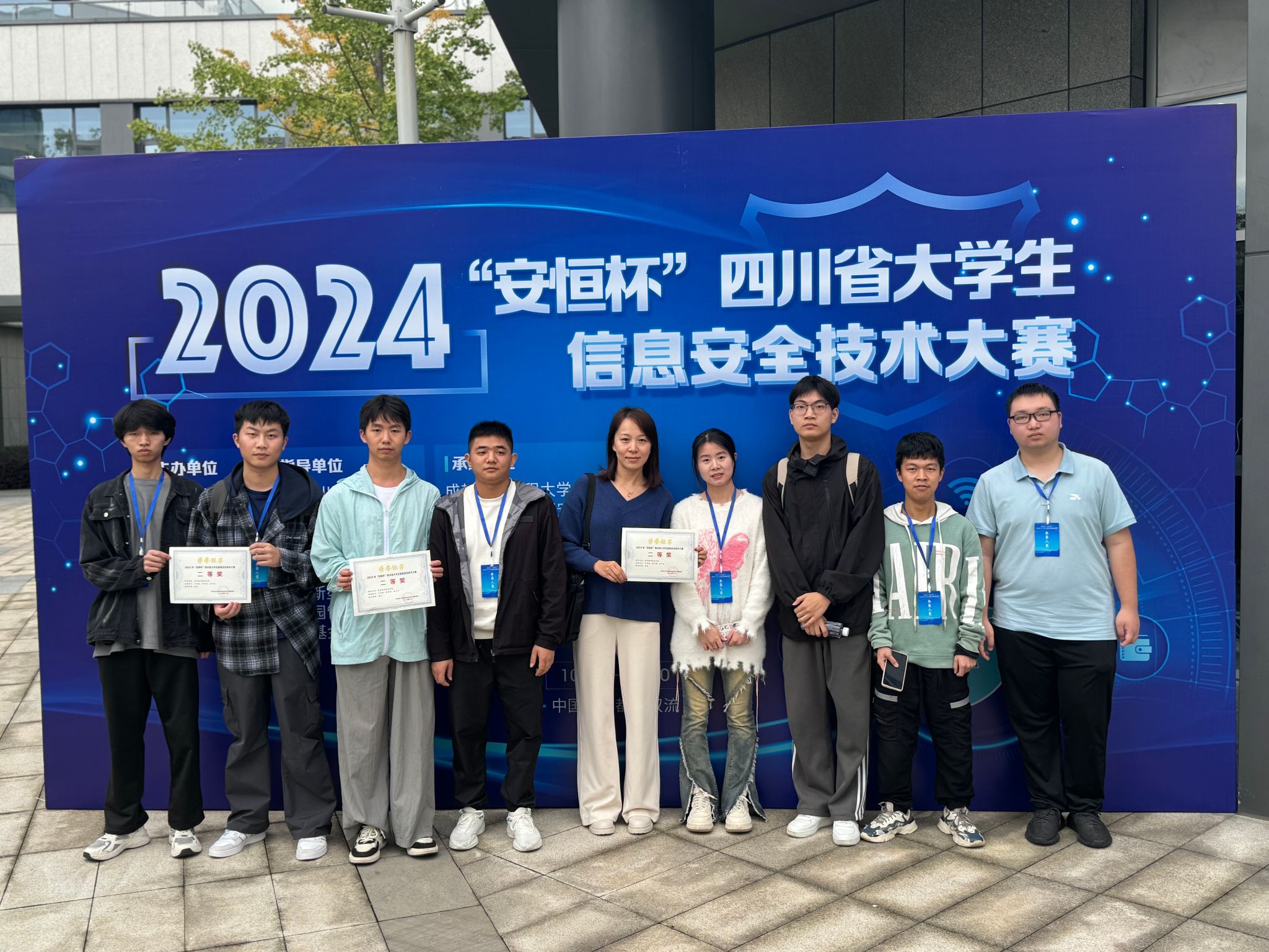 2024年10月,由四川省教育厅主办,中共四川省委网信办和四川省公安厅协办的2024年“安恒杯”四川省大学生信息安全技术大赛在成都信息工程大学双流新型产业学院举行,开元官网信息技术系组织了3支队伍9名学生参赛,最终由张珍老师指导的商务一队斩获二等奖。