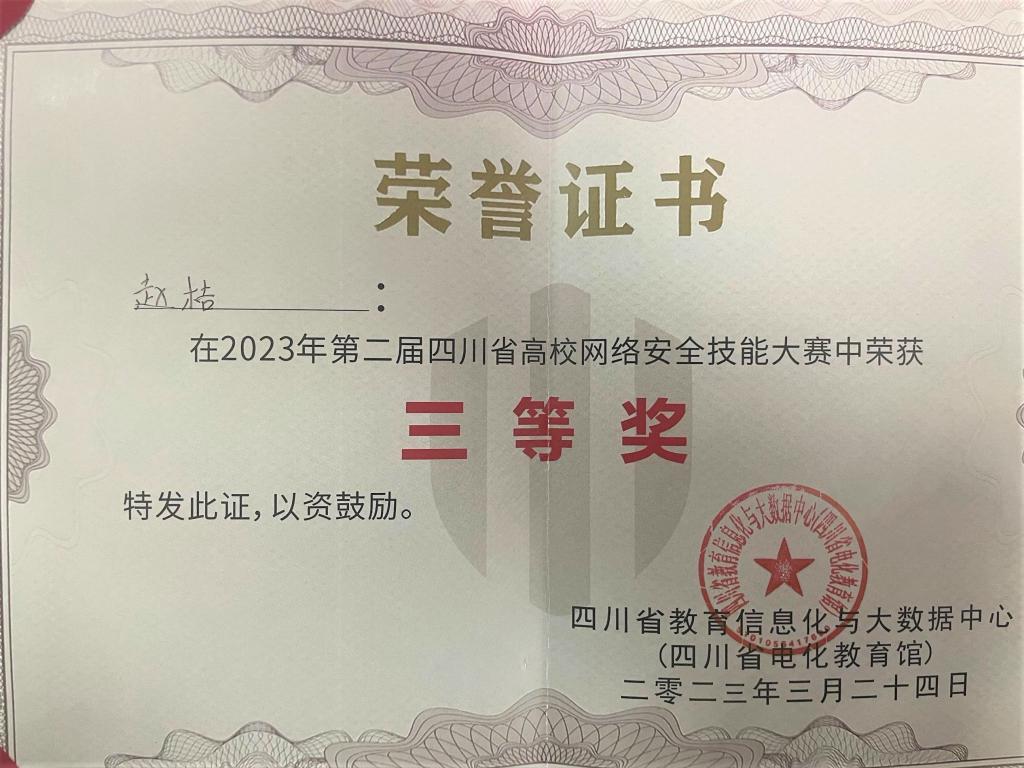 同时,由四川省教育信息化与大数据中心主办的“第二届四川省高校网络安全技能大赛决赛”于3月24日举行,学院实践教学中心罗小东主任亲临现场指导和鼓励。经过激烈角逐,最终由信息安全技术应用专业邵林老师指导的赵桔、姚坤杰团队获得高职组三等奖。