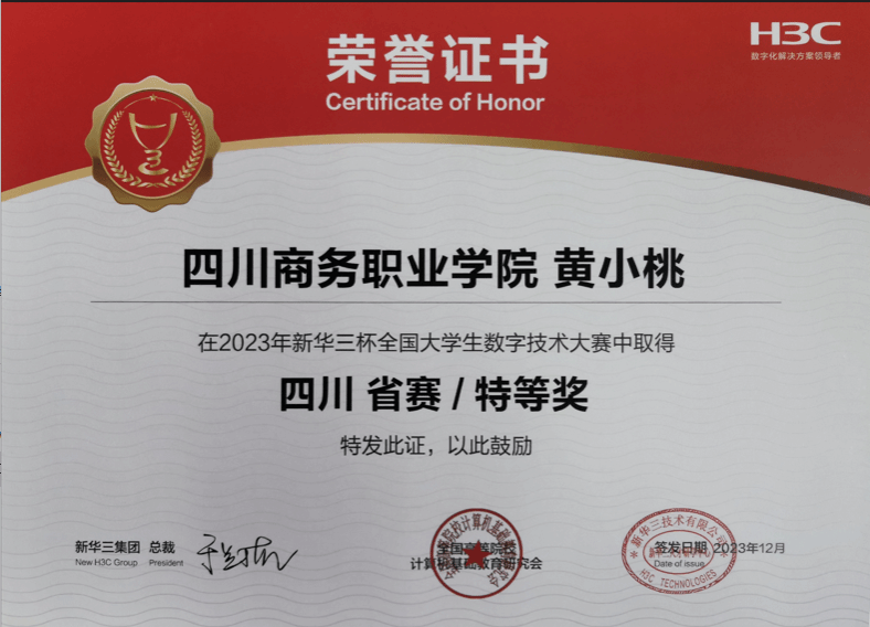 2023年10月14日,我系承办、实践教学中心协办的四川省“新华三杯”全国大学生数字技术大赛预赛圆满完成, 111名学生完成比赛,其中6人进入省赛复赛。在12月9日的复赛中,由牟凯老师指导的22级信息安全技术应用1班黄小桃同学凭借扎实的专业知识和过硬的技能素养,斩获省赛特等奖,并顺利进入全国总决赛。全国总决赛将于2024年4月在杭州新华三集团总部举行。