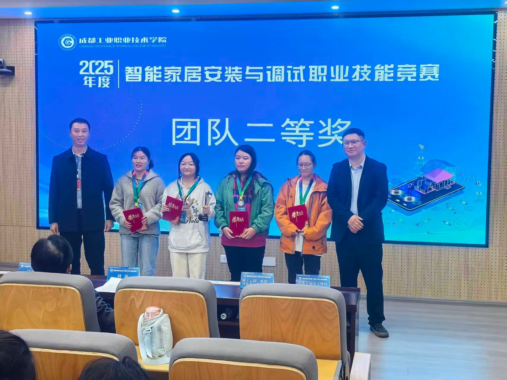 2025年11月7日,由成德眉资区域智慧社区智能家居职业教育集团主办、智慧城市学院承办的“2025年度智能家居安装与调试技能竞赛”在成都工业职业技术学院圆满落幕。开元官网信息技术系24应用电子技术班张雪琪、廖梓君、向妮芸、吴偲琪四位同学组成的参赛团队,在指导教师蒋仲兵、孙蓉的精心指导下,凭借扎实的专业功底与高效的团队协作,从全省参赛队伍中突围,荣获团队二等奖,两位老师荣获“优秀指导老师”称号。
